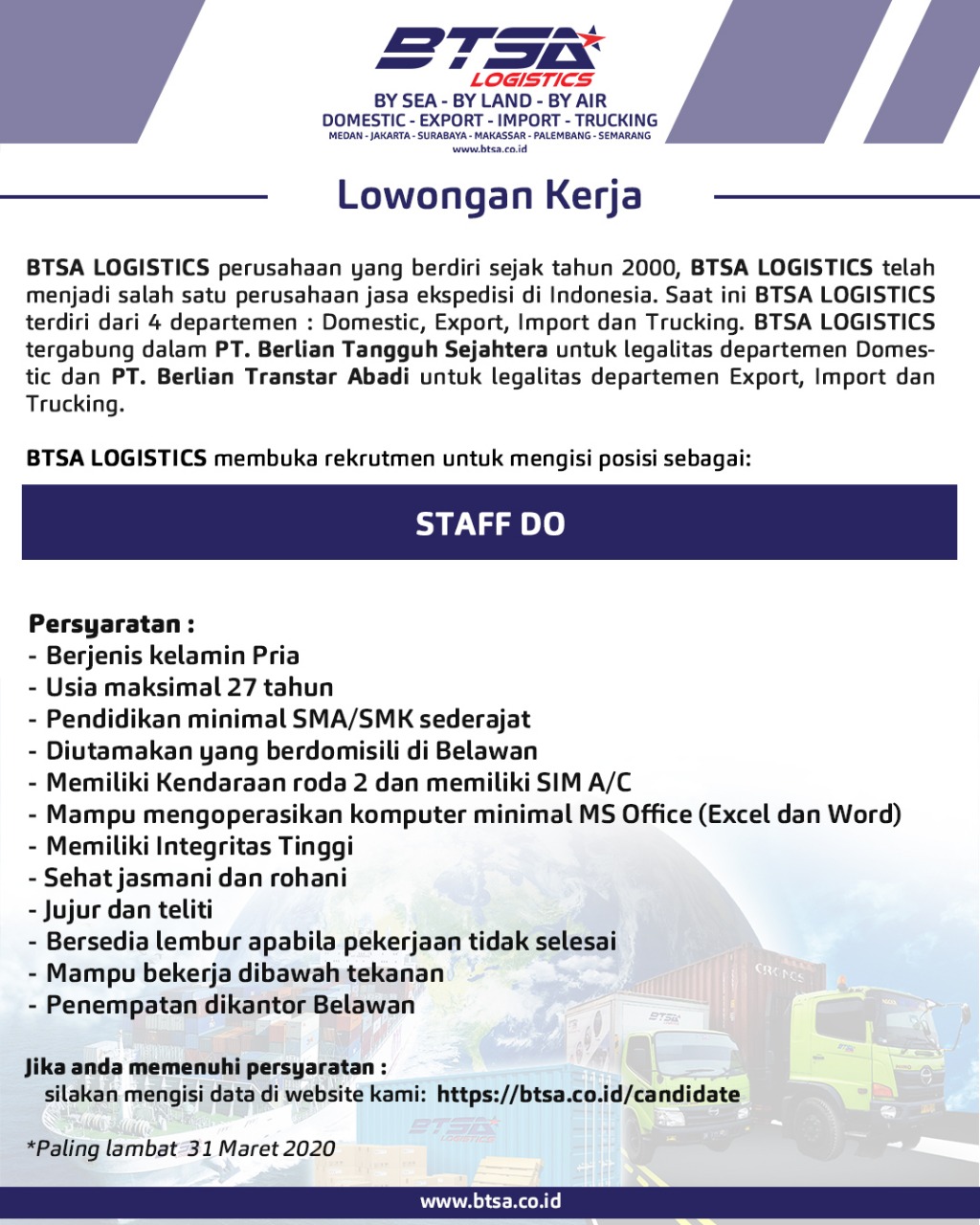 Info Loker Medan Terbaru STAFF DO BTSA Logistik Medan - LOKERMEDAN.ID - Pusat Lokernya Medan