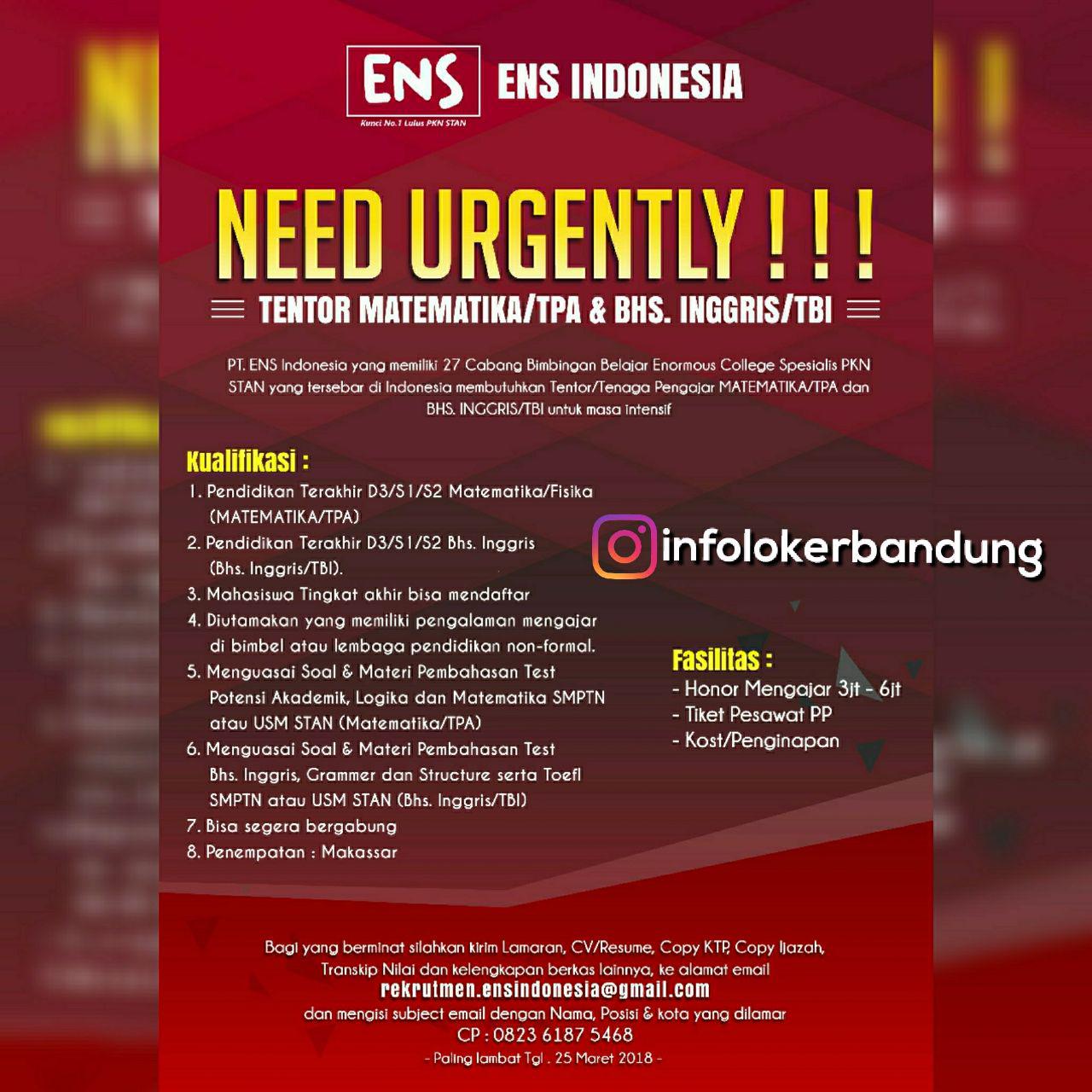 Lowongan Kerja ENS Indonesia Maret 2018 - Info Loker Bandung 2021