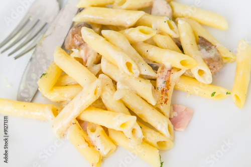 Macaroni carbonara on a white dish and … | Stock image | Colourbox