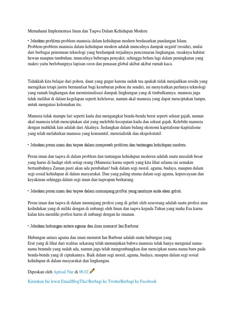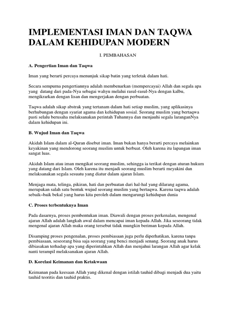 DOC) IMPLEMENTASI IMAN DAN TAQWA DALAM KEHIDUPAN MODERN | dinda …