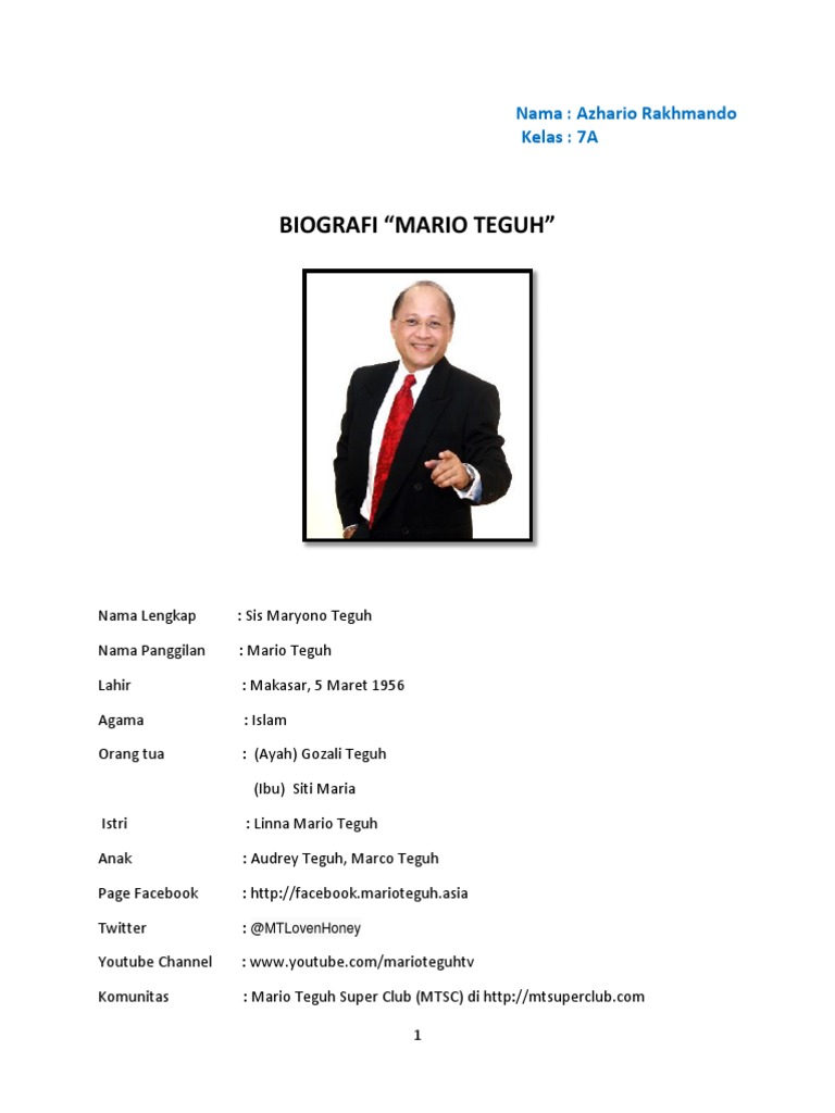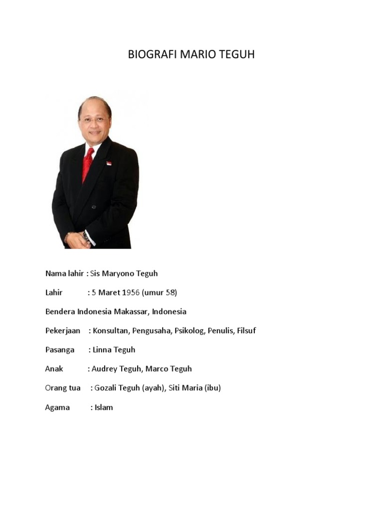 Biography of Mario Teguh • Full Name : Sis Maryono Teguh • Place, Date of Birth : Makassar • Date - Brainly.co.id