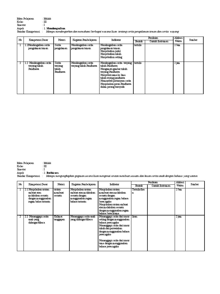 Silabus Bahasa Jawa Kelas 3 Semester 1 Dan 2