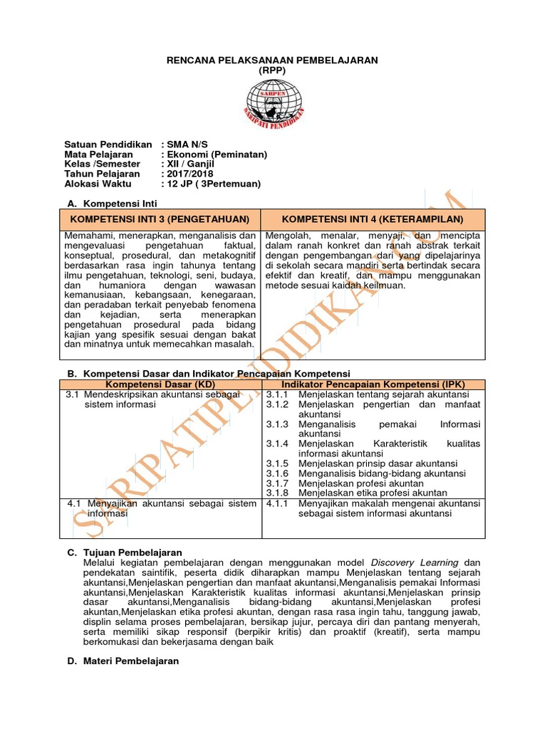 1 RENCANA PELAKSANAAN PEMBELAJARAN (RPP) Sekolah : SMA Mata Pelajaran : Ekonomi Kelas/Semester : XI/2 Materi Pokok : Kerja… | Education, Words, Microsoft excel