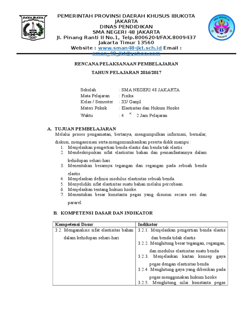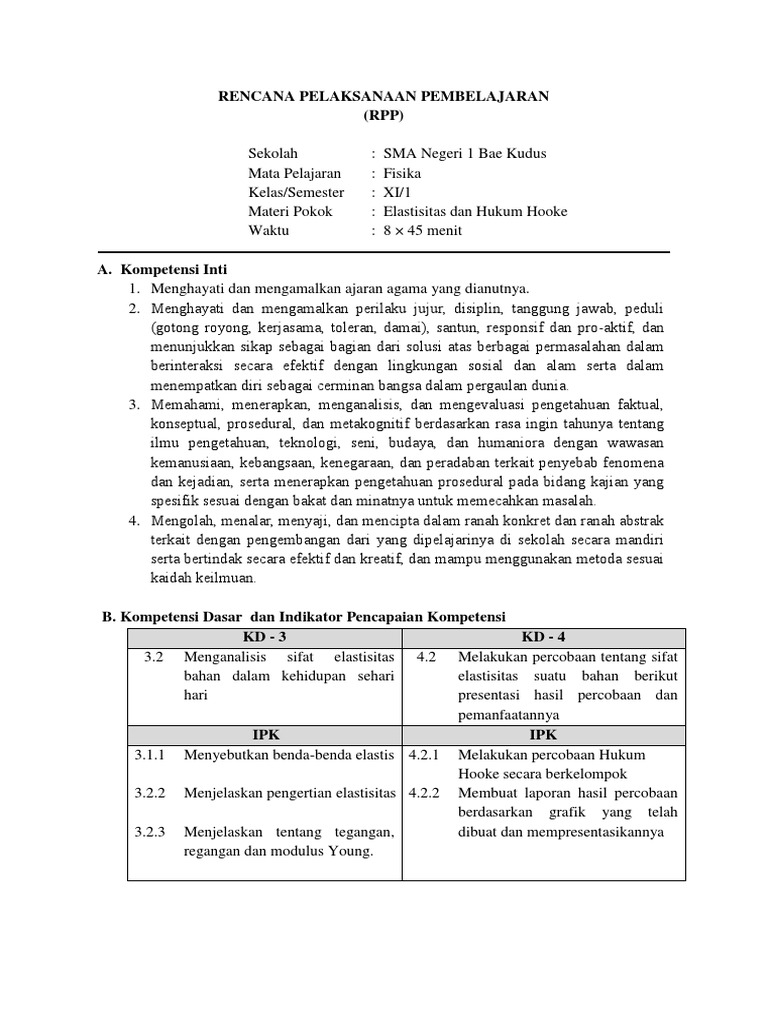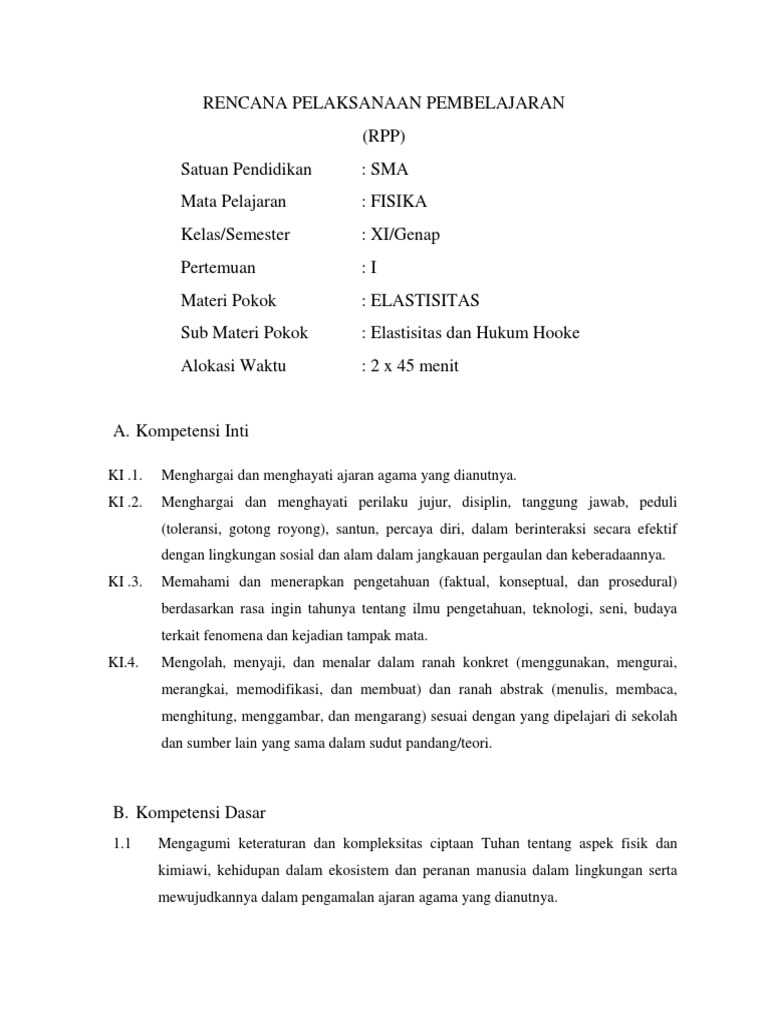 Rpp Elastisitas Dan Hukum Hooke kurikulum 2013