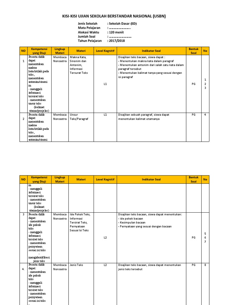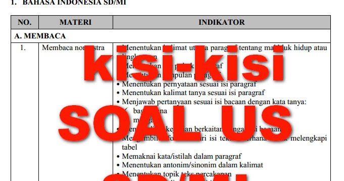 Kisi-Kisi Ujian Sekolah (US) Tahun 2018 Untuk SD/MI - Datadikdasmen
