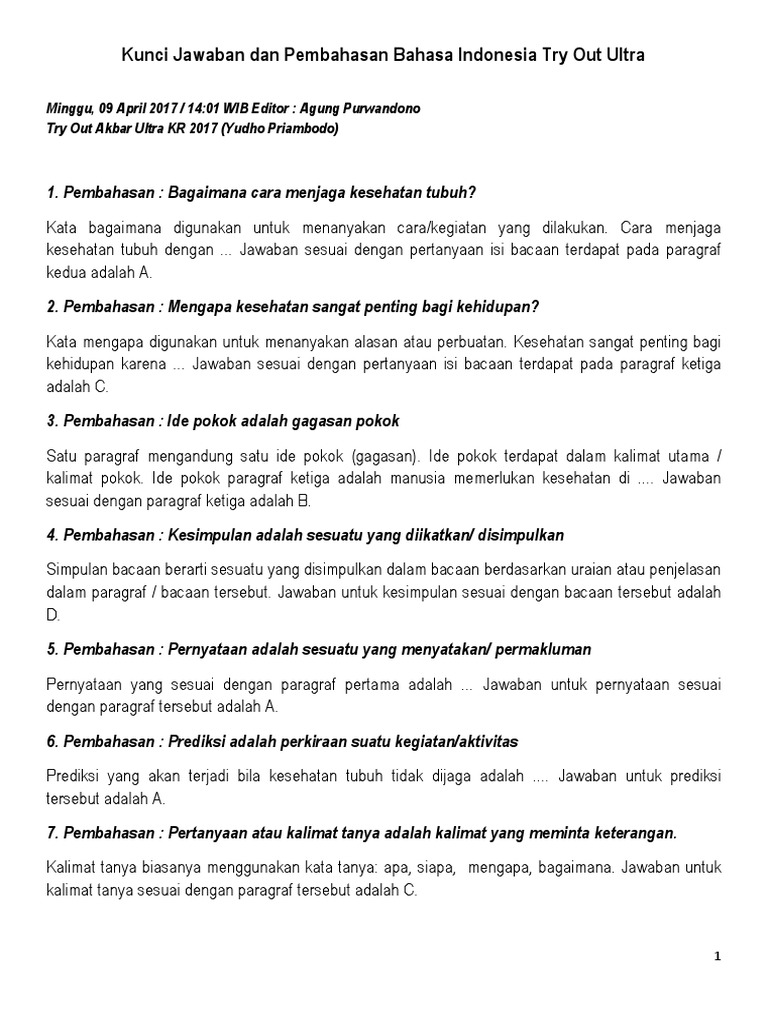 Kunci Jawaban Dan Pembahasan Bahasa Indonesia Try Out Ultra