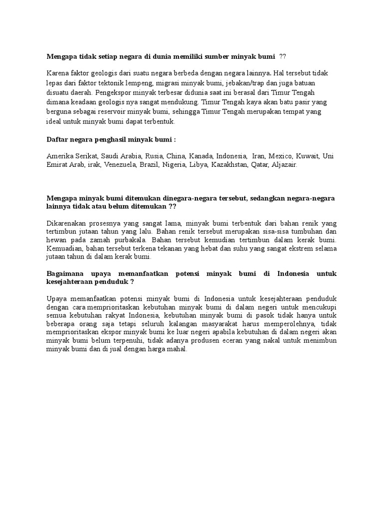 1. mengapa tidak setiap negara di dunia memiliki sumber minyak bumi 2. tulislah negara mana saja - Brainly.co.id