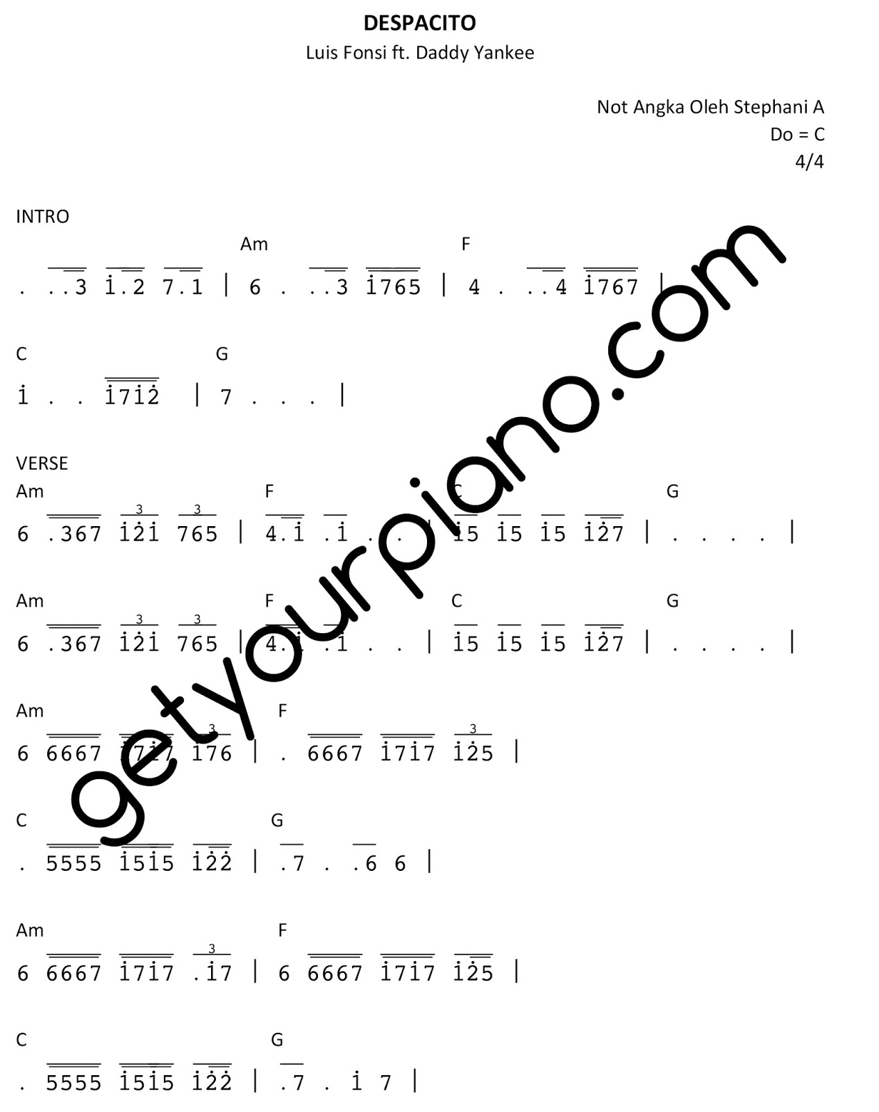Not Angka Lagu Despacito Piano Pianika Luis Fonsi Ft Daddy Yankee