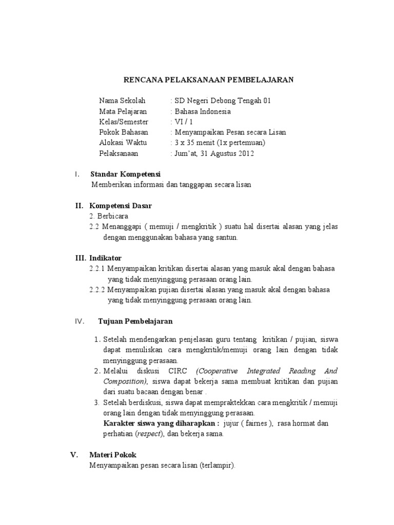 Rpp Bahasa Indonesia Kelas 6 Semester 1 Dan 2