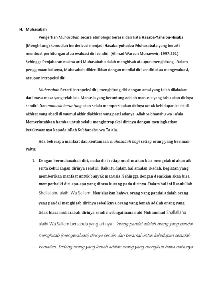 H. Muhasabah: Muhasabah Berarti intropeksi diri, menghitung diri …
