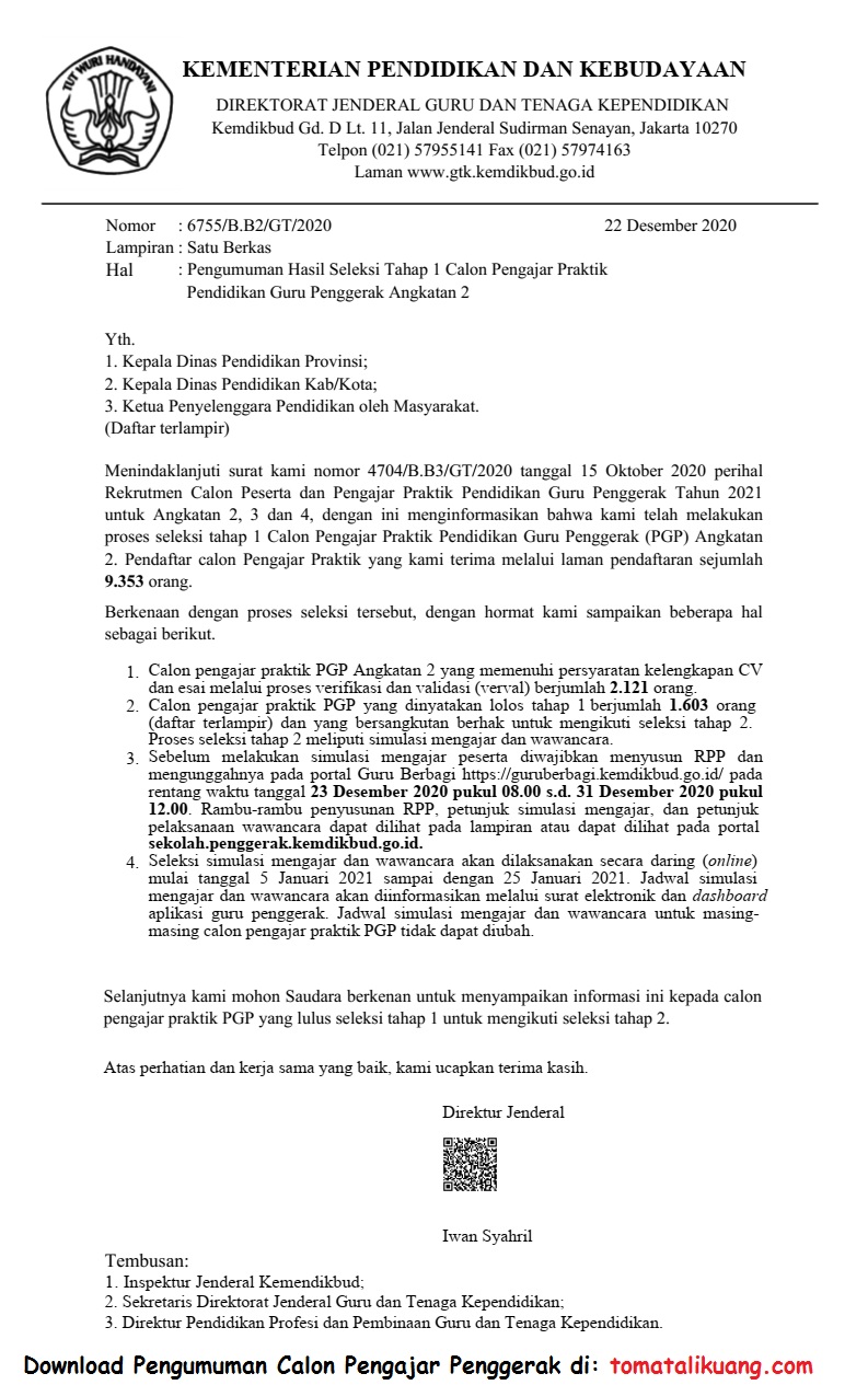 Daftar Peserta Lolos Seleksi Tahap 1 Calon Pengajar Penggerak Angkatan 2 Tahun 2020 - Tomatalikuang.com - Berita Pendidikan Terbaru