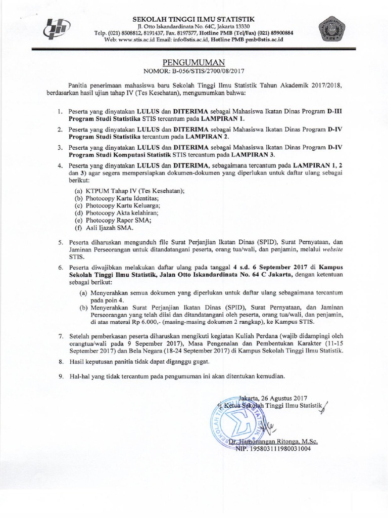 Pengumuman Kelulusan Akhir –Hasil Ujian Tahap IV– PMB STIS 2017