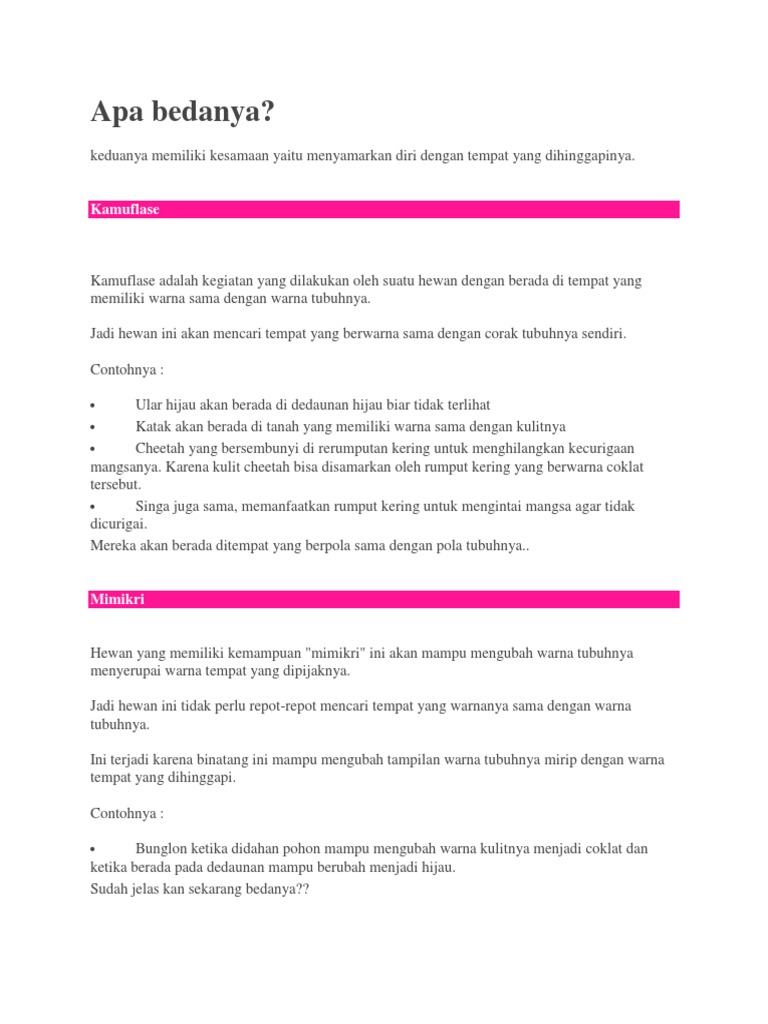 jawablah pertanyaan berikut ini 1.apa perbedaan kamuflase dan mimikri?2.apa tujuan hewan melakukan - Brainly.co.id