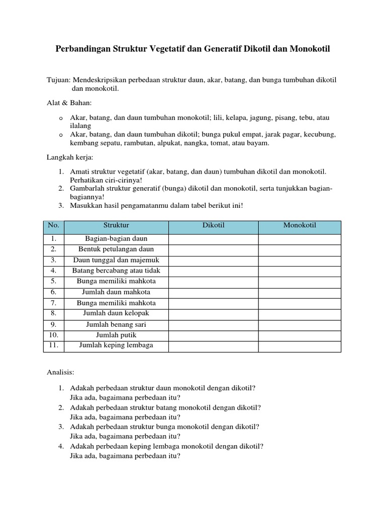 Tabel tentang perbedaan struktur anatomi tumbuhan monokotil dan …