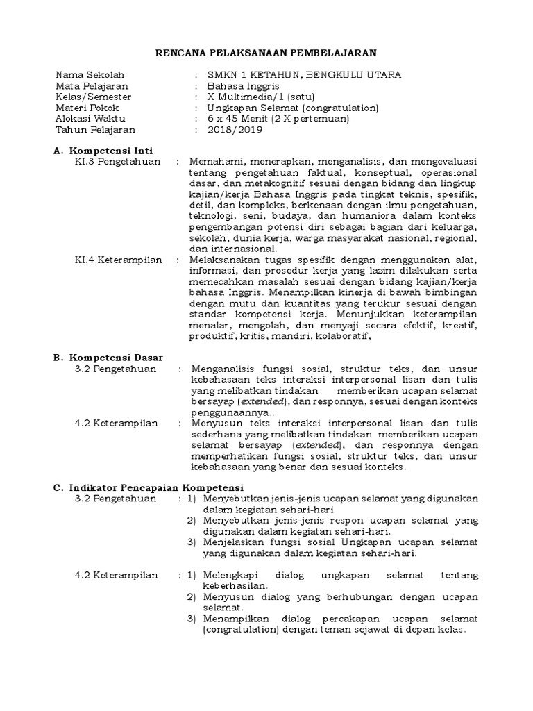 Rpp Bahasa inggris SMK kelas X congratulation - [PDF Document]