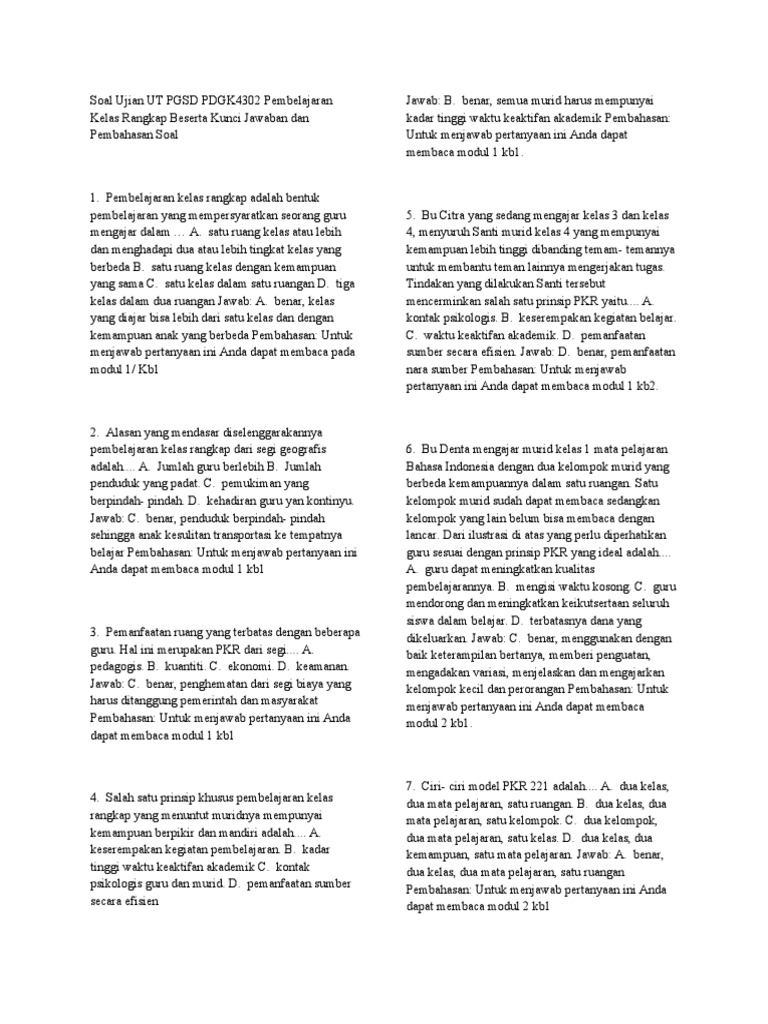Soal Ujian UT PGSD PDGK4302 Pembelajaran Kelas Rangkap …