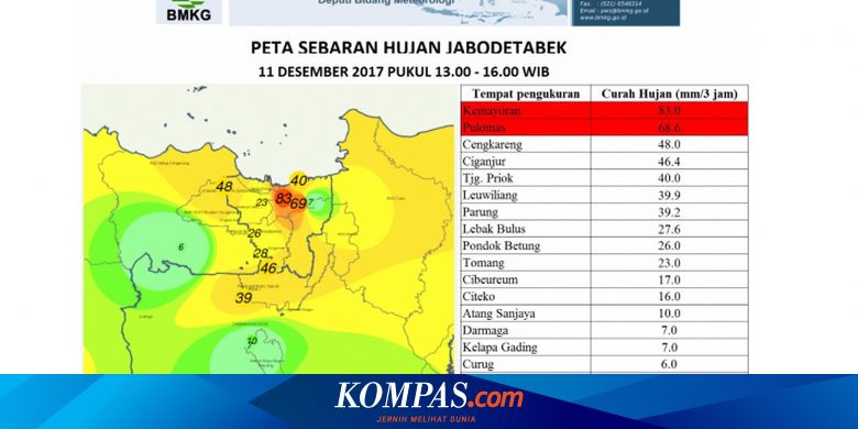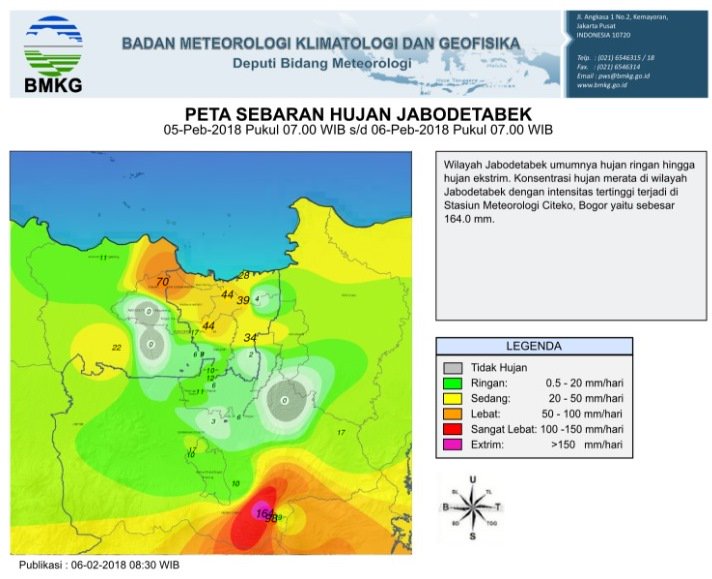 Humas_BMKG در توییتر “Kemarin beberapa wilayah jabodetabek di guyur sedang-lebat, berikut peta sebaran hujan di wil Jabodetabek. Curah Hujan tertinggi di stasiun Meteorologi Citeko Bogor, 164.0 mm/ hari.… https://t.co/GqQpsEh9ur”