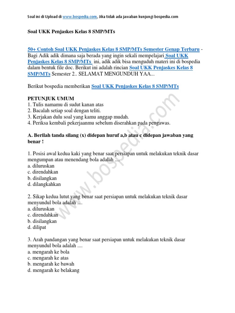 50 Contoh Soal UKK Penjaskes Kelas 8 SMP MTs Semester Genap