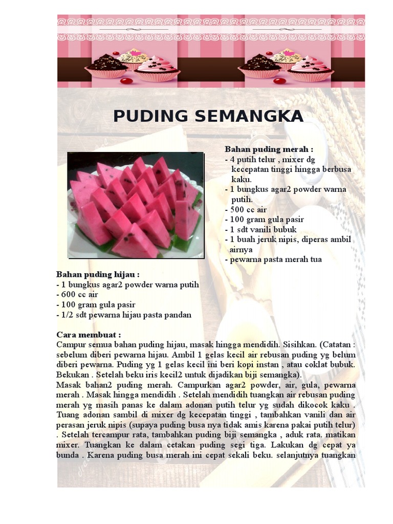Resep mama maknyus - KLIK SHARE/BAGIKAN UNTUK SAVE RESEP INI Resep Puding Buah Bahan-bahan 1 buah semangka merah 2 buah kiwi hijau 10 buah strawberry 1 buah mangga harum manis 1 buah