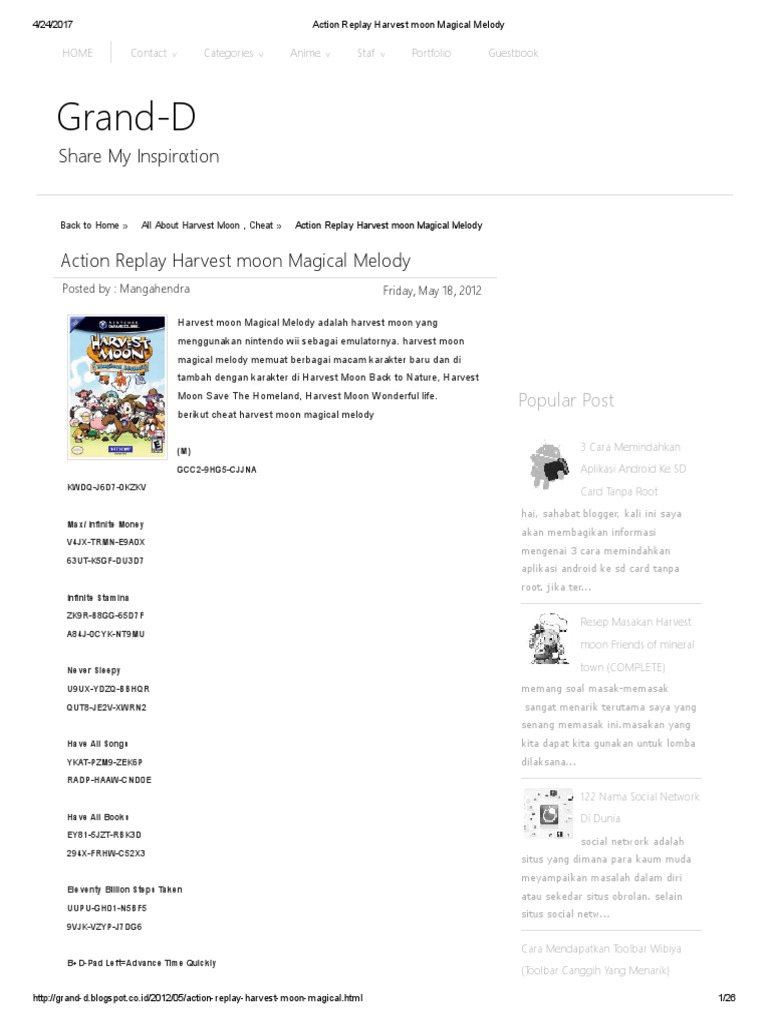 Action Replay Harvest Moon Magical Melody