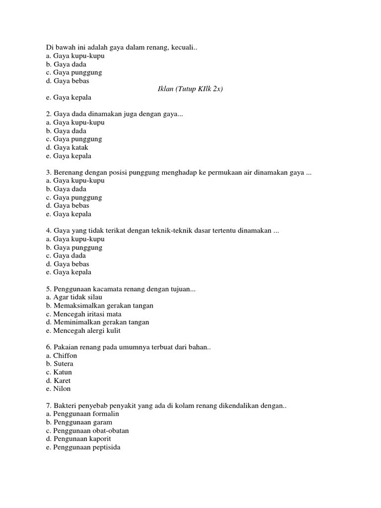 Soal Latihan Pilihan Ganda Penjaskes Bab Renang Beserta …