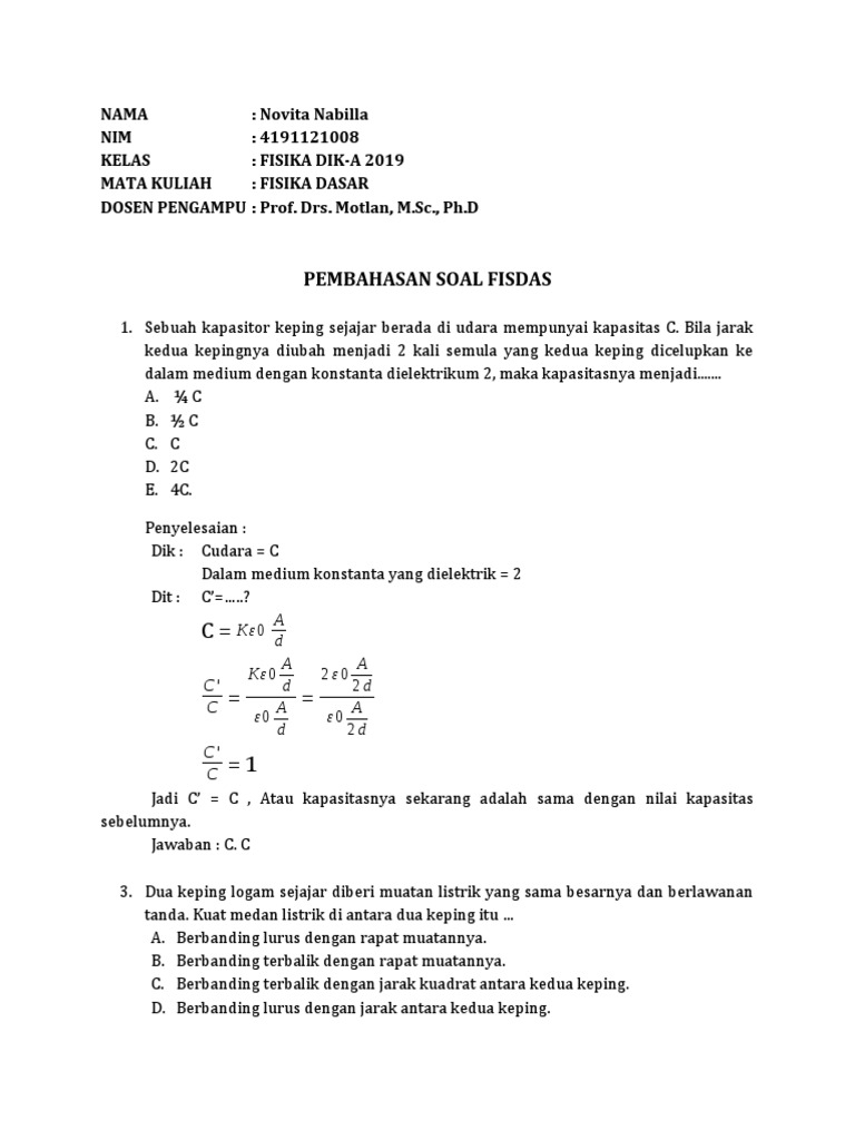 Sebuah kapasitor keping sejajar kapasitasnya C ketika kedua kepingnya dipisahkan oleh udara. Jika - Brainly.co.id
