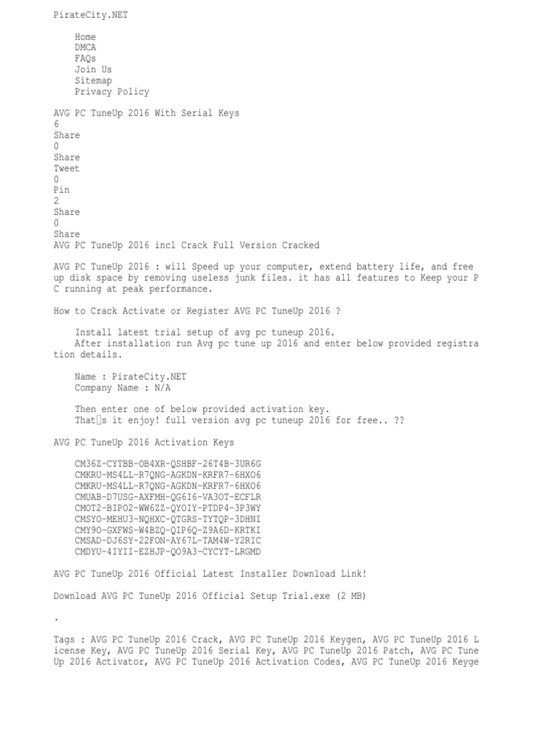 PirateCity.NET Home DMCA FAQs Join Us Sitemap Privacy Policy AVG PC TuneUp 2016 With Serial Keys 6 Share 0 Share Tweet 0 Pin 2 S