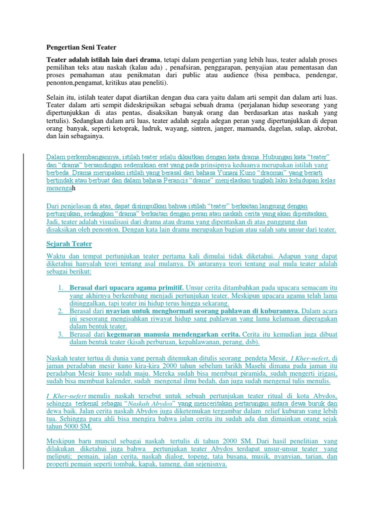 Pengertian Seni Teater Teater adalah istilah lain dari drama, tetapi dalam pengertian yang lebih luas, teater adalah proses