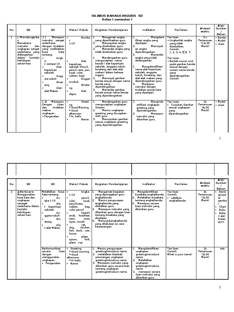 Silabus Bahasa Inggris SD KTSP Kelas 1, 2, 3, 4, 5, 6 - Jagoan …