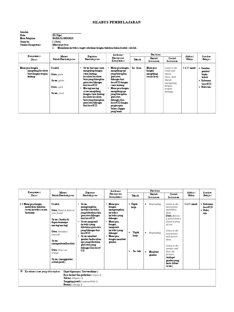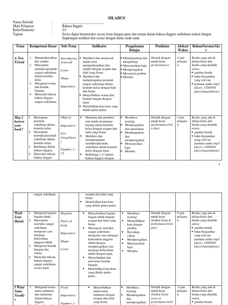 Silabus Bahasa Inggris SD Berkarakter Untuk Kelas 1, 2, 3, 4, 5 …