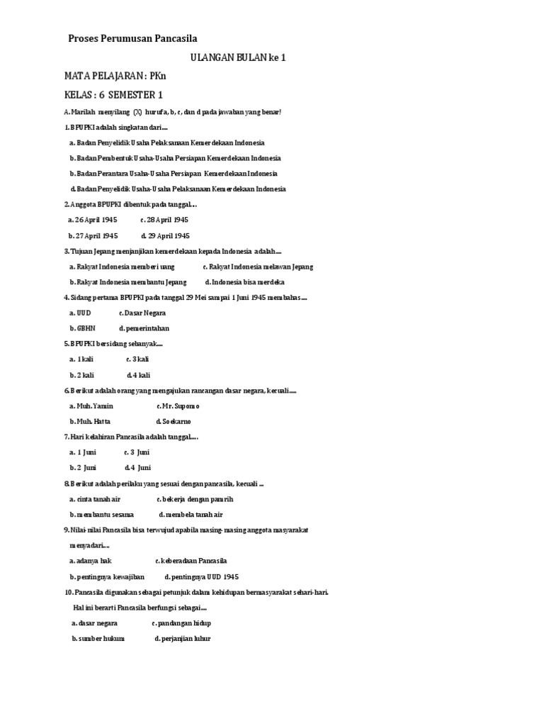 SOAL ULANGAN TENGAH SEMESTER GANJIL .Mata pelajaran : PKN Hari, tgl : Kelas / Semester : 6 (enam) / 1 Jam … 10. Pancasila digunakan sebagai petunjuk dalam kehidupan bermasyarakat - [PDF Document]