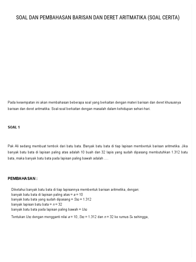 Contoh Soal Cerita Deret Aritmatika Dan Pembahasannya