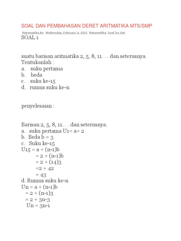 Soal Dan Pembahasan Deret Aritmatika Mts