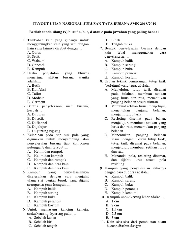 Tryout Ujian Nasional Jurusan Tata Busana Smk 2018
