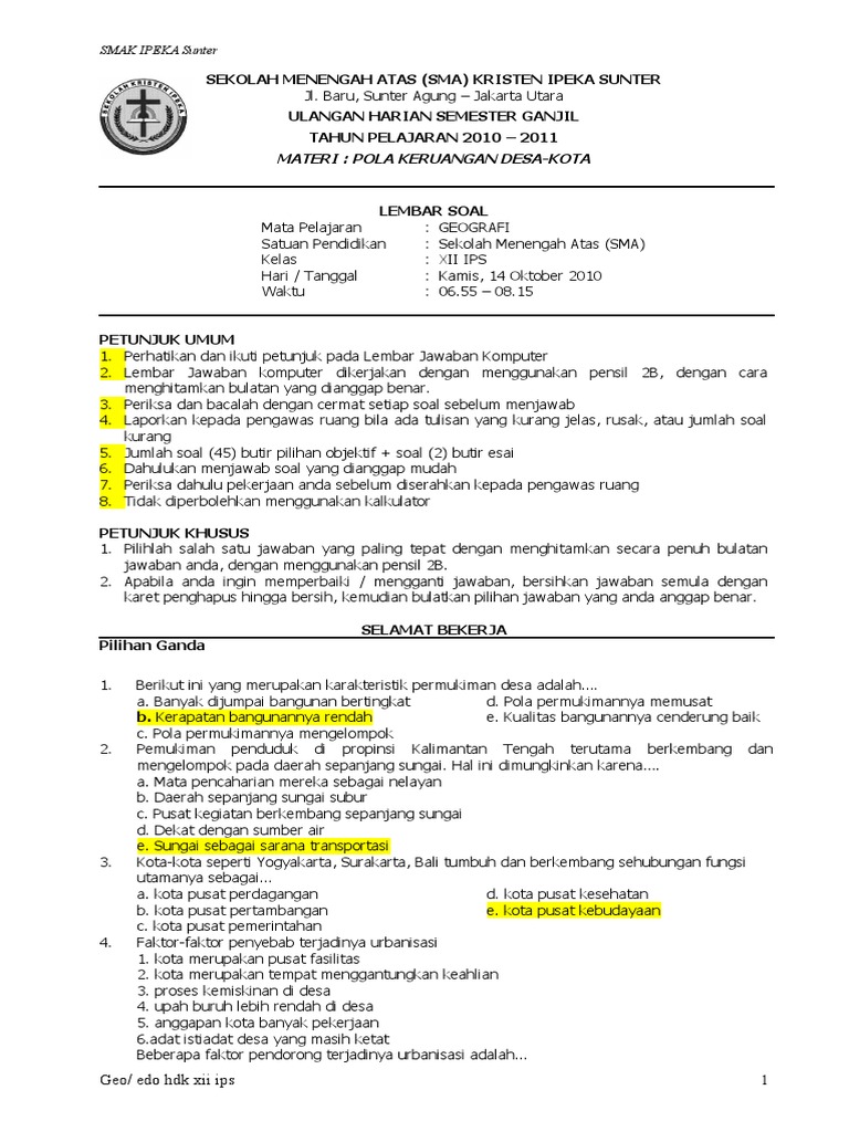 Soal Dan Jawaban Geografi Kelas 12 Semester 1