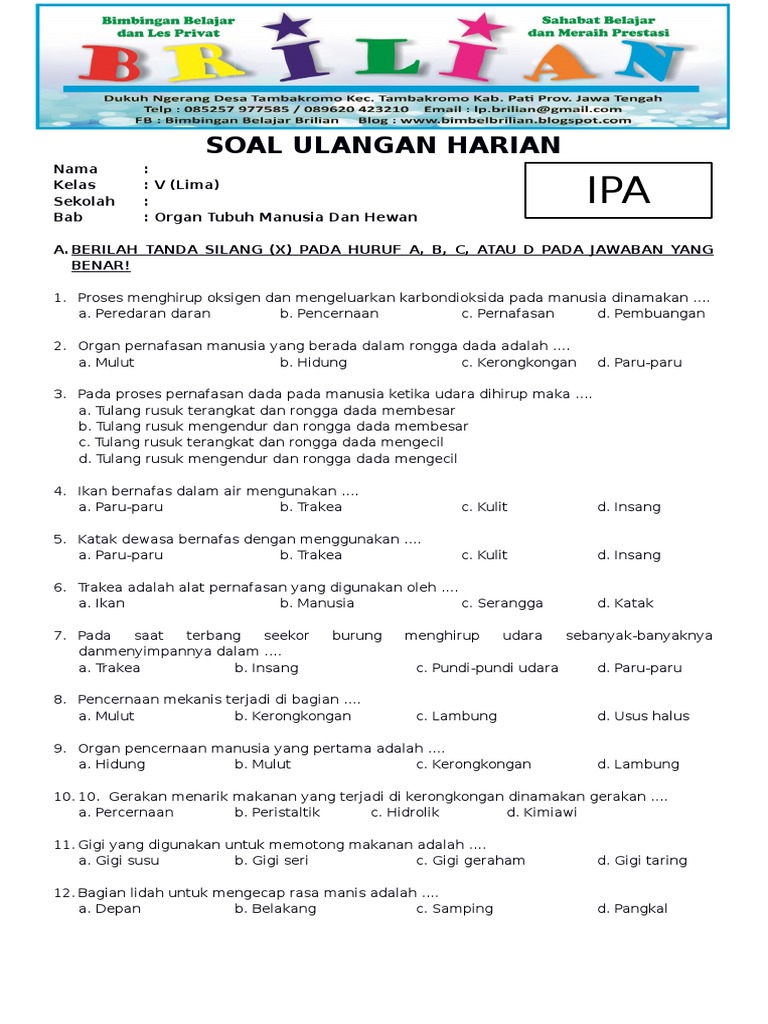 Soal IPA Kelas 5 SD Bab 1 Organ Tubuh Manusia Dan Hewan …