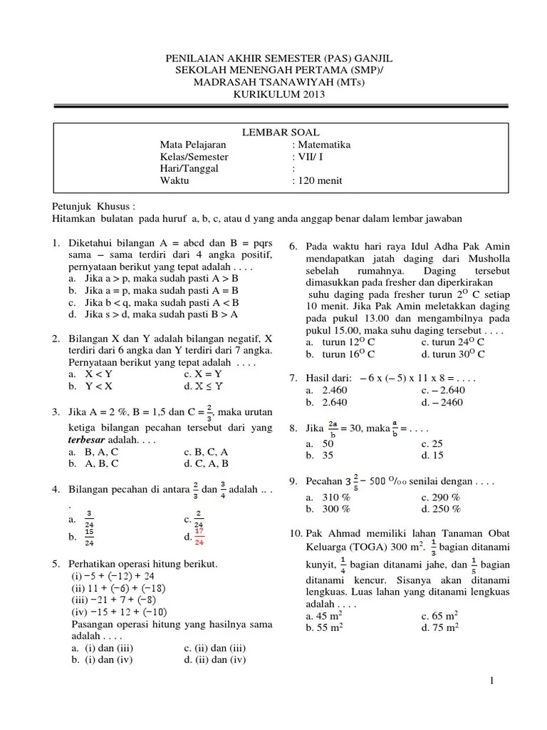 Pembahasan Soal Pas Matematika Smp Mts Kelas 7 Kurikulum 2013 …