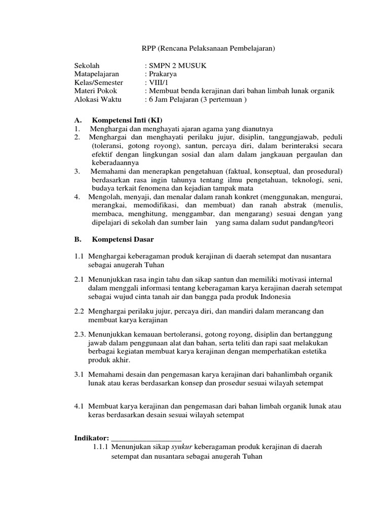 RPP Prakarya Kelas 7 Semester 1 Kurikulum 2013 Revisi 2017 | SILABUS
