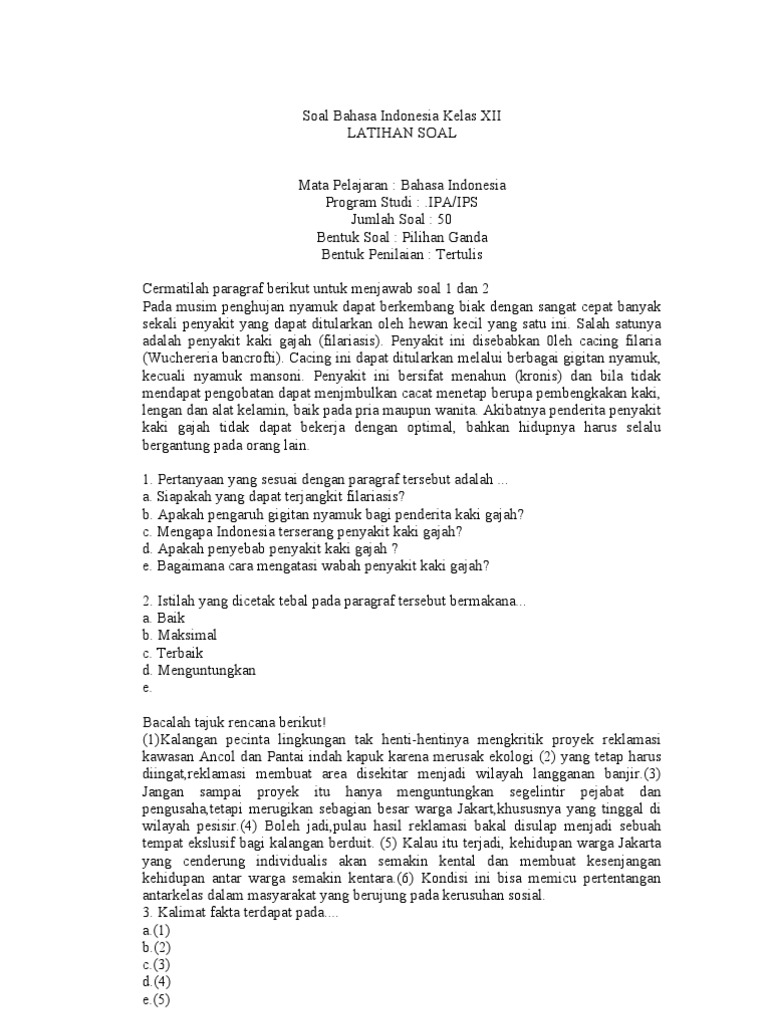 Soal Bahasa Indonesia Kelas 12 [+Kunci Jawaban] 2020