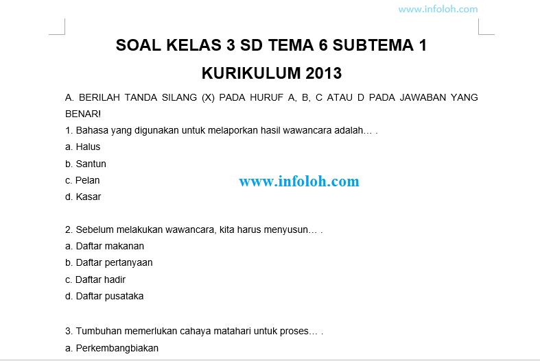 Soal Tematik Kelas 3 SD Tema 6 Subtema 1 Kurikulum 2013 Revisi …