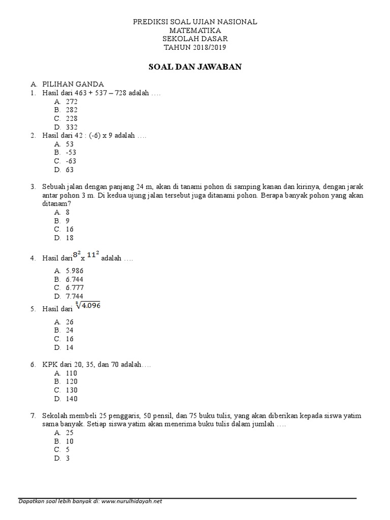 Prediksi Soal USBN SD Matematika Tahun 2019 - SekolahDasar.Net