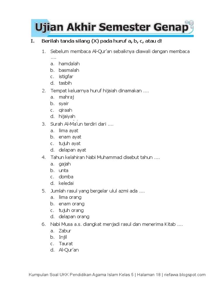 Soal UKK / UAS 2 Pendidikan Agama Islam Kelas 5 Tahun Ajaran 2018 …