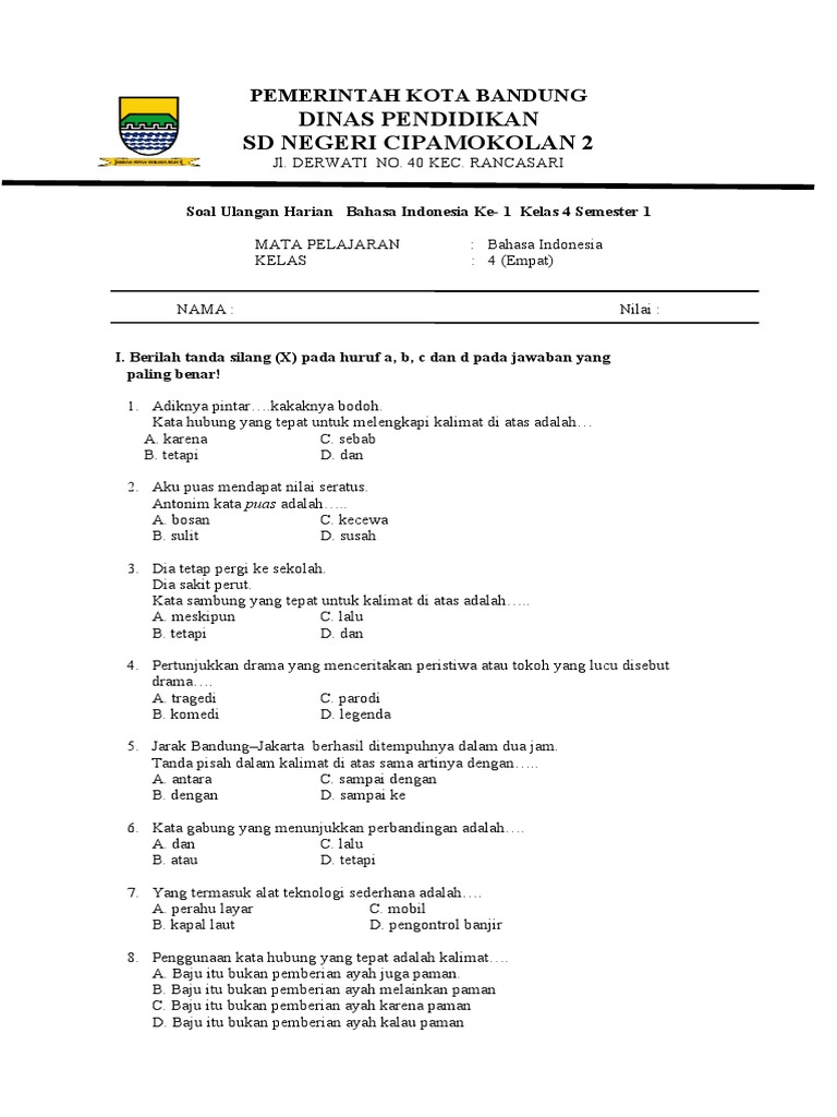 Soal Uts Bahasa Indonesia Kls 4 Sd Semester 2