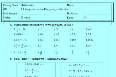 Soal Ulangan Harian Matematika Kelas 5 Semester 1 Kurikulum 2013 Revisi 2017