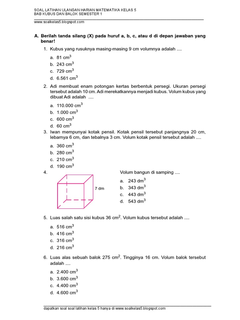 Soal Ulangan Harian Matematika K13 Kelas 5 Volume - SekolahDasar.Net