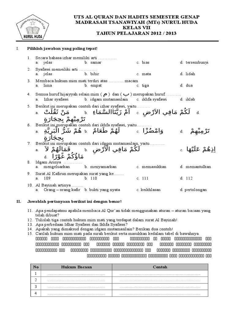 Lengkap Soal Uas Qurdits Mts Kelas 7 Semester 1 Tahun Pelajaran …