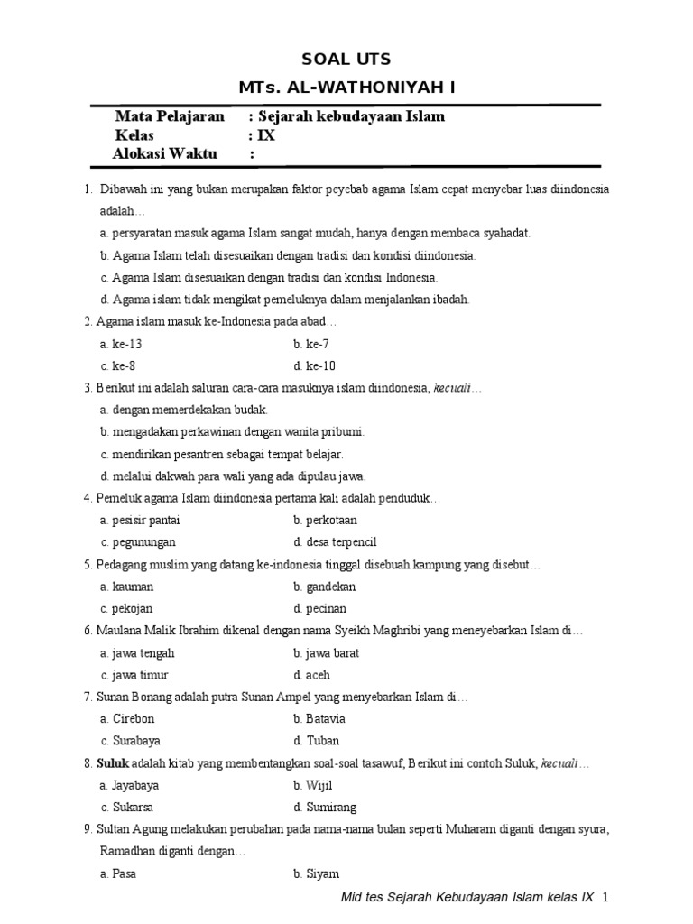 Soal UTS SKI Kelas 8 MTs Semester 2 (Genap) - Kumpulin Soal UTS s …