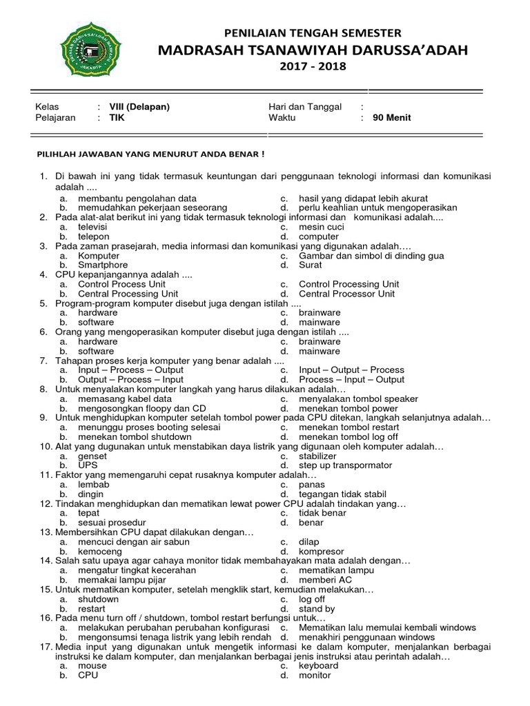 Soal PTS/UTS TIK Kelas 8 SMP/MTs Semester 1 Kurikulum 2013 …