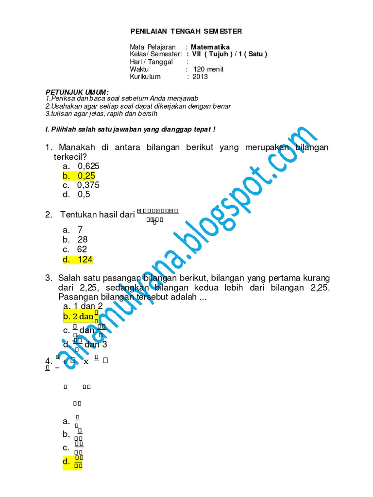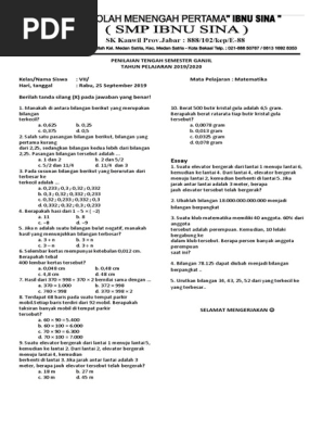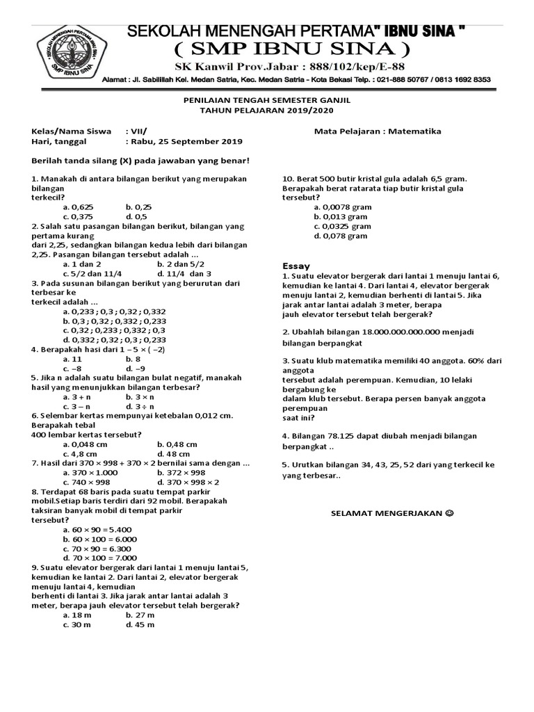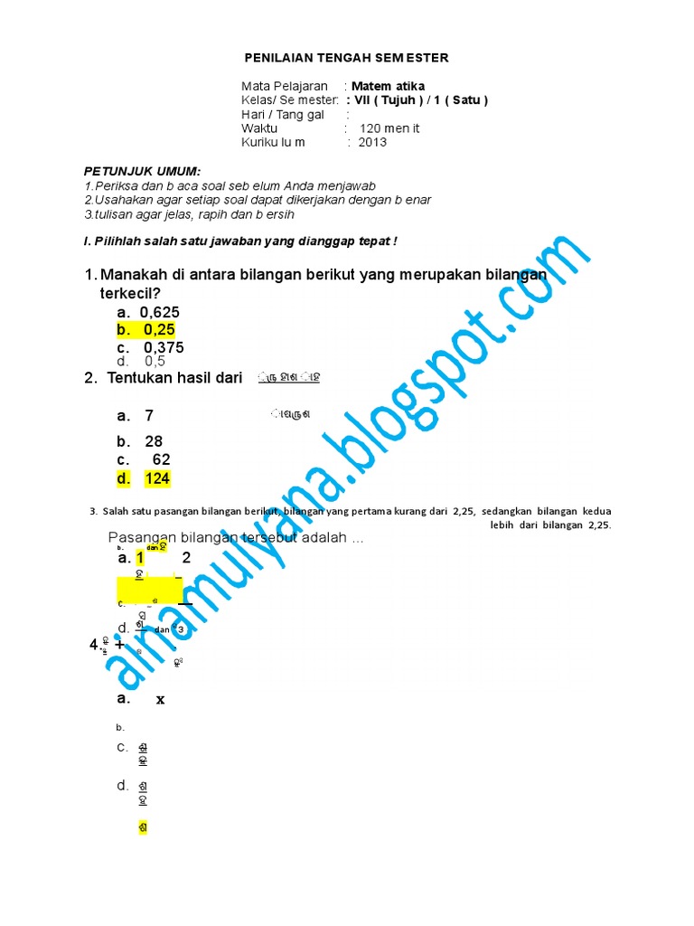 Soal Matematika Penilaian Akhir Semseter Kelas VII/1