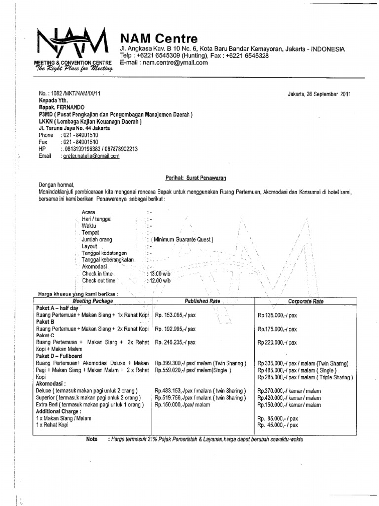 Surat Penawaran Paket Meeting Nam Centre Hotel - p3md